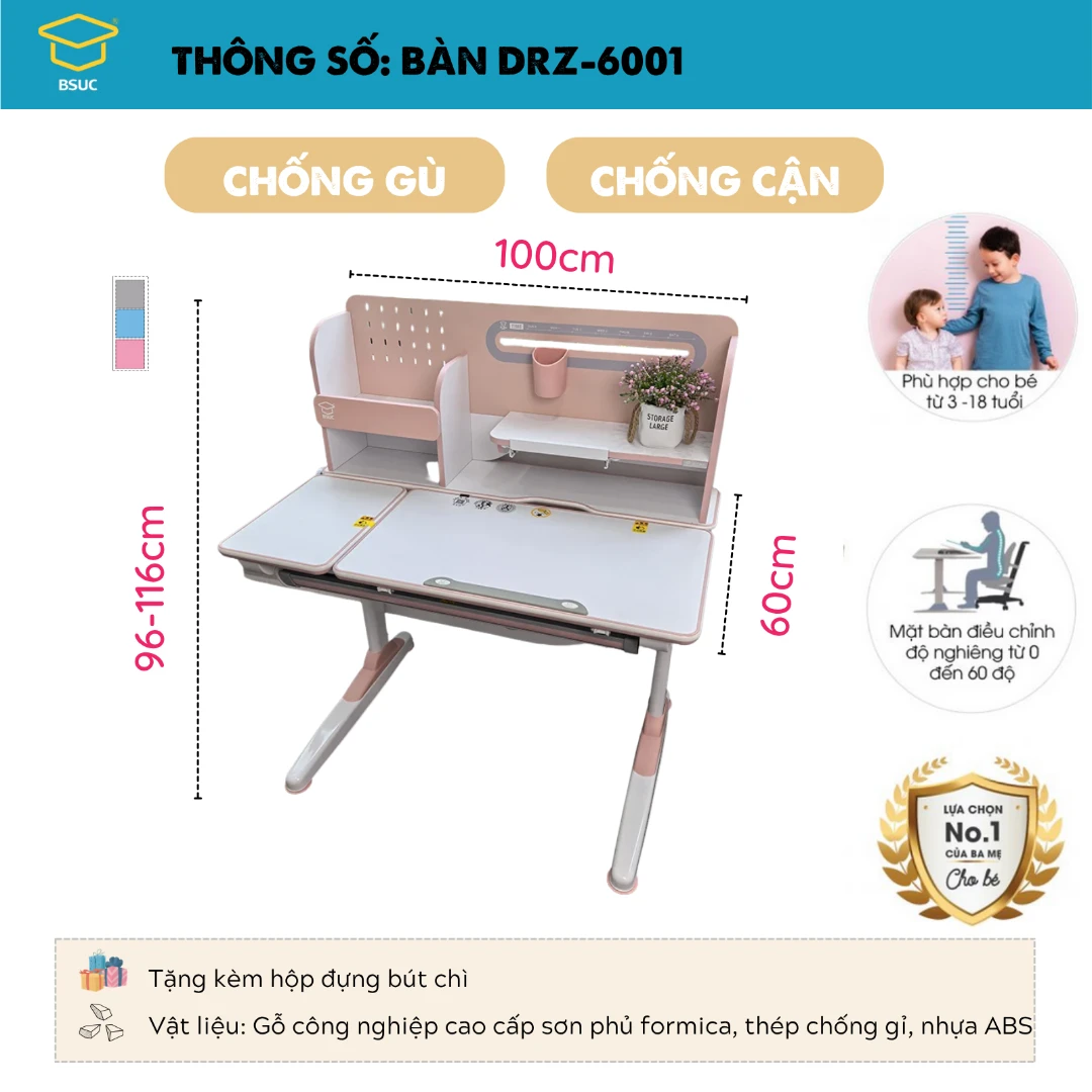 - ☑ Điều chỉnh linh hoạt bàn ghế giúp đồng hành cùng bé ở mỗi giai đoạn phát triển từ 3 – 18 tuổi;