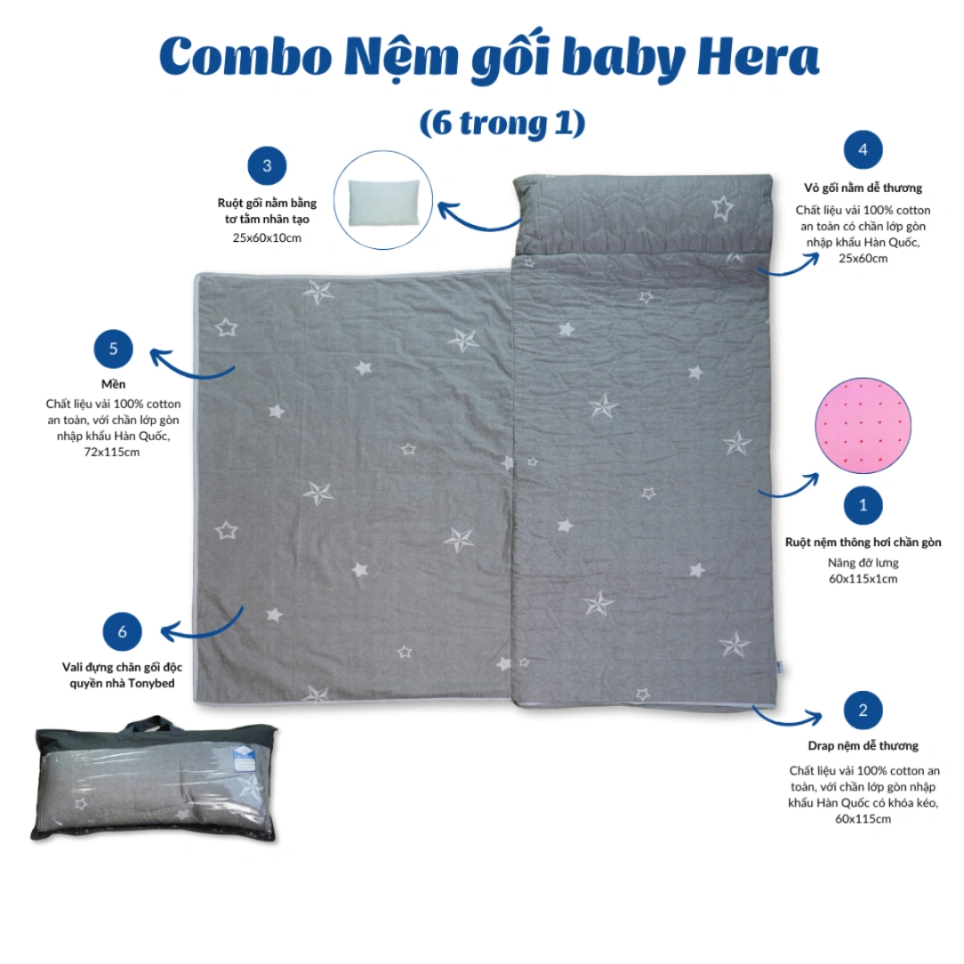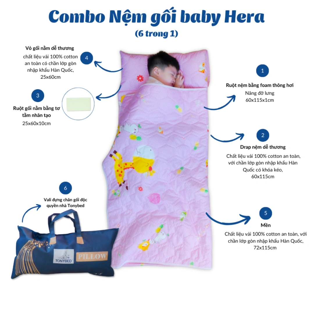Combo nệm gối cho bé 6 trong 1 Baby Hera được chế tạo từ foam HD cao cấp, tuân thủ nghiêm ngặt công nghệ sản xuất hiện đại của Singapore. Điều này giúp nệm sở hữu nhiều ưu điểm vượt trội như: Khả năng nâng đỡ tối ưu; Bền bỉ theo thời gian; Thoáng khí ưu việt; An toàn tuyệt đối, không gây kích ứng da của bé; Khả năng giảm áp lực; Và dễ vệ sinh; Gối với ruột gòn nhập khẩu, kích thước tiêu chuẩn 25x60cm, độ cao 10cm, giúp bé có tư thế ngủ đúng, ngăn ngừa các vấn đề về sức khỏe. Vỏ gối Cotton chần gòn nhập khẩu Hàn Quốc.Bộ sản phẩm được thiết kế siêu tiện ích với sự kết hợp giữa nệm và mền, dễ dàng gấp gọn, áo nệm có thể tháo rời kèm theo vali xách tiện lợi