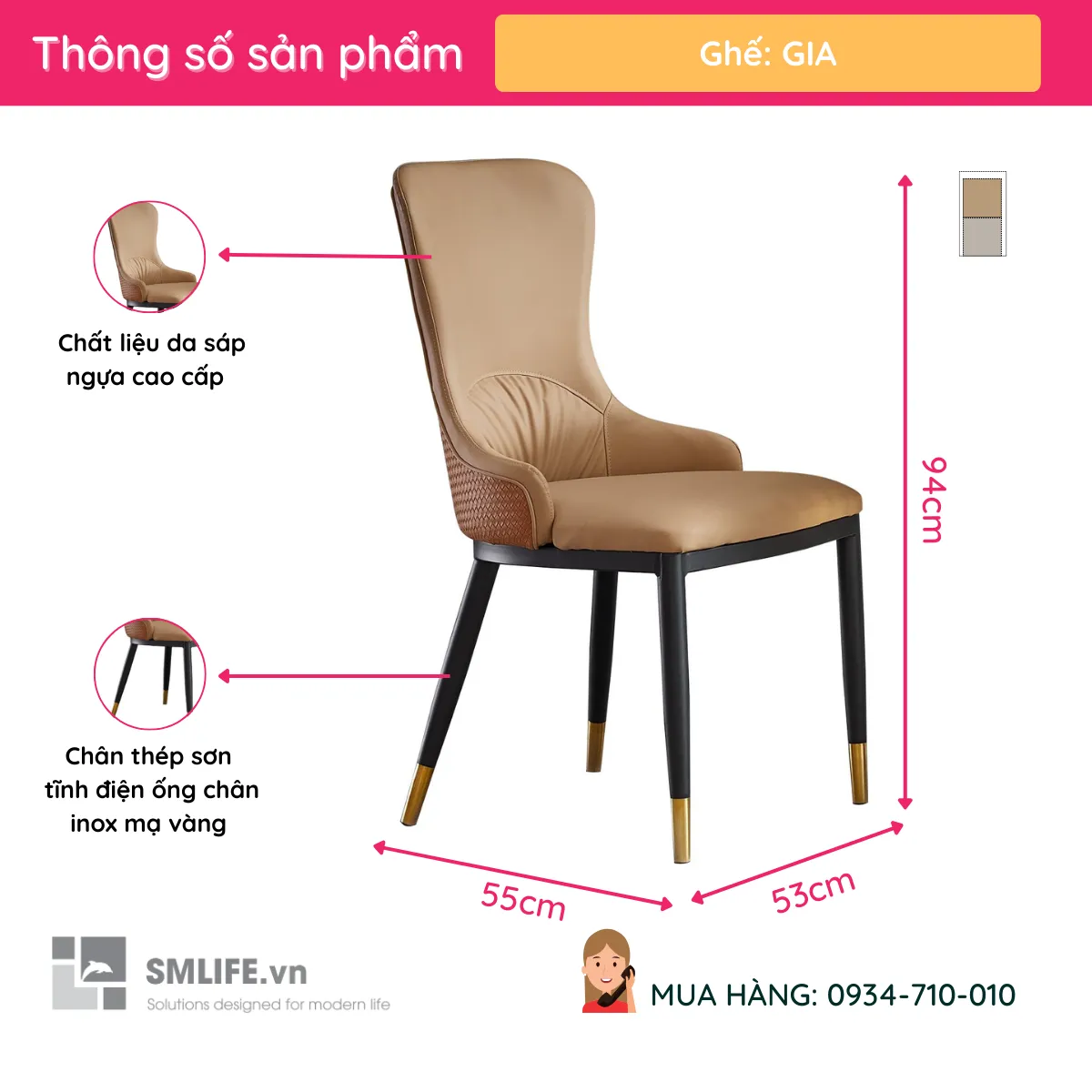 Ghế cafe da cao cấp chân thép sơn tĩnh điện ống chân inox mạ vàng GIA được thiết kế với dáng vẻ thanh lịch hiện đại và tinh tế và ghế có độ bền cao. Là lựa chọn thích hợp cho quán cafe hay không gian phòng ăn của bạn. Ghế ăn, ghế cafe SMLIFE sẽ khiến cho khách hàng cảm thấy thoải mái khi vừa ngồi vừa uống cafe và trò chuyện với nhau như ở nhà. Không chỉ dành riêng cho quán cafe mà chiếc ghế này cũng có thể được sử dụng ở nhà cho những ai thích có không gian riêng ở nhà để tận hưởng cuộc sống yên bình bên bạn bè và người thân.
