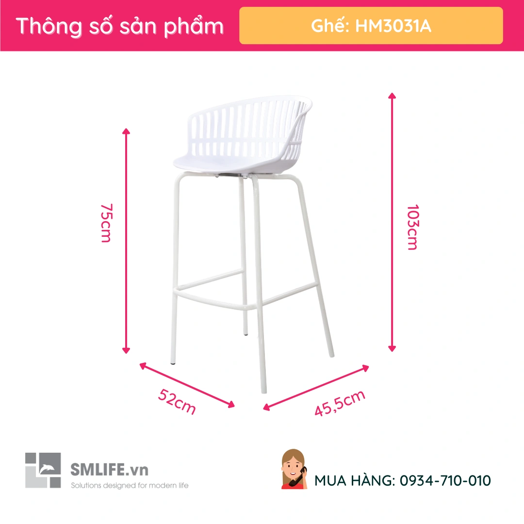 Ghế quầy bar giá rẻ lưng nhựa chân sắt sơn tĩnh điện HM3031A được thiết kế với dáng vẻ thanh lịch hiện đại. Ghế có độ bền cao. Là lựa chọn thích hợp cho quán cafe, quán bar với chi phí đầu tư thấp mà vẫn mang lại hiệu quả cao.