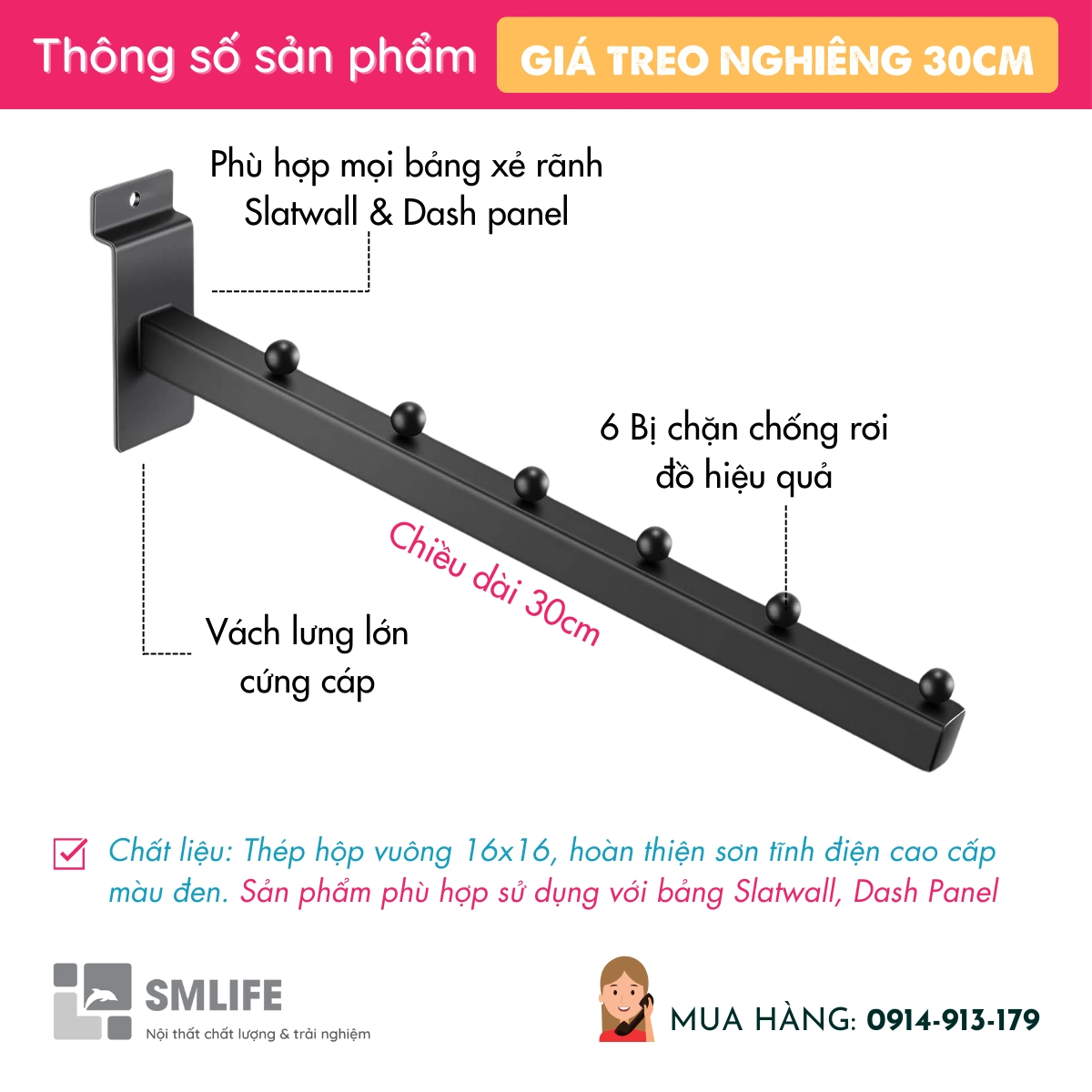 Giá treo nghiêng 30cm Slatwall mang đến sự linh hoạt trong việc trưng bày các sản phẩm tại cửa hàng của bạn. Thiết kế giá treo nghiêng giúp tạo không gian trưng bày tối ưu, dễ dàng tiếp cận các mặt hàng, đặc biệt là các sản phẩm như túi xách, giày dép, hoặc phụ kiện thời trang. Với chất liệu thép sơn tĩnh điện cao cấp, sản phẩm có độ bền và khả năng chống ăn mòn cao.
