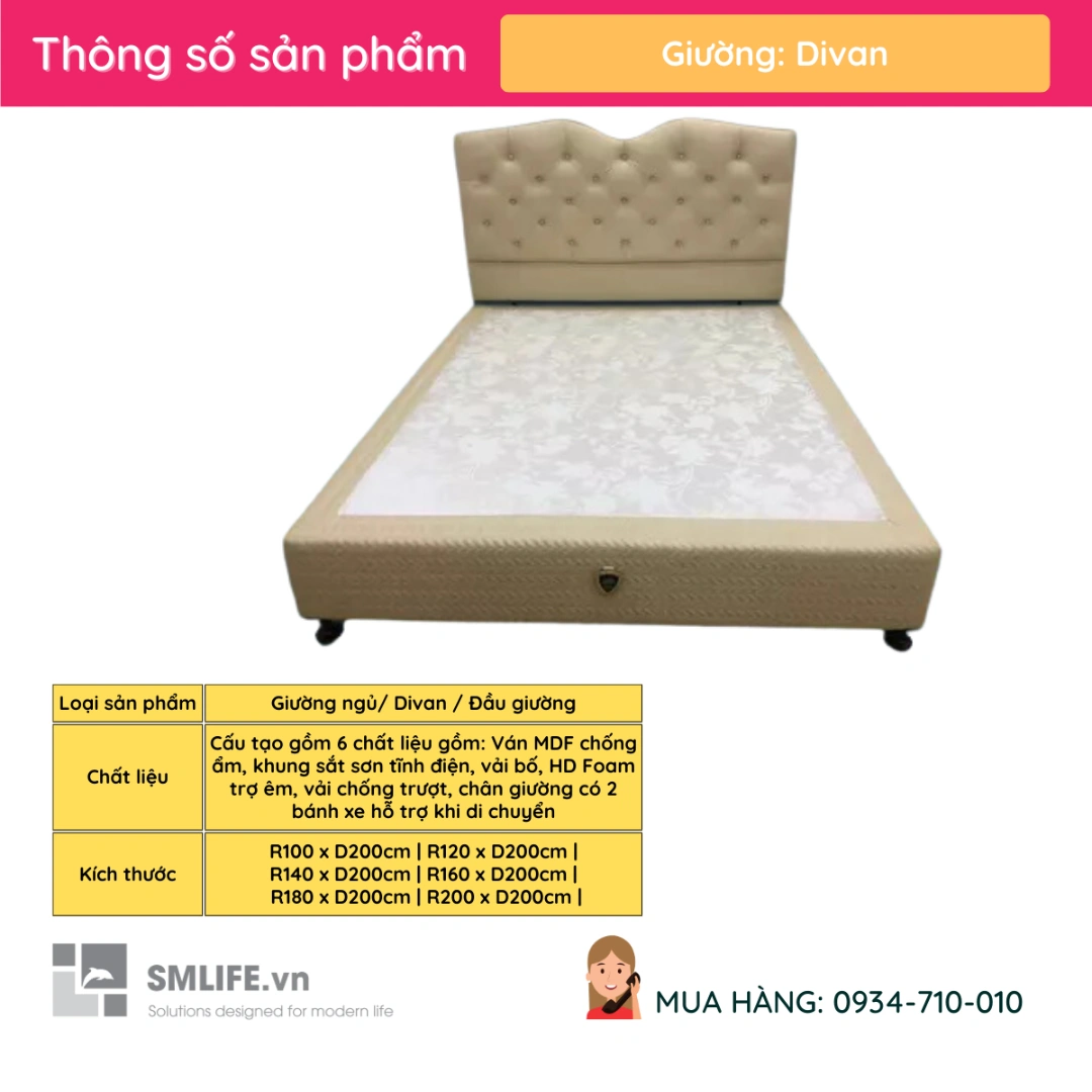 Kích thước | Có 6 kích thước Divan: R100 x D200cm, R120 x D200cm, R140 x D200cm, R160 x D200cm, R180 x D200cm, R200 x D200cm kết hợp với đầu giường |