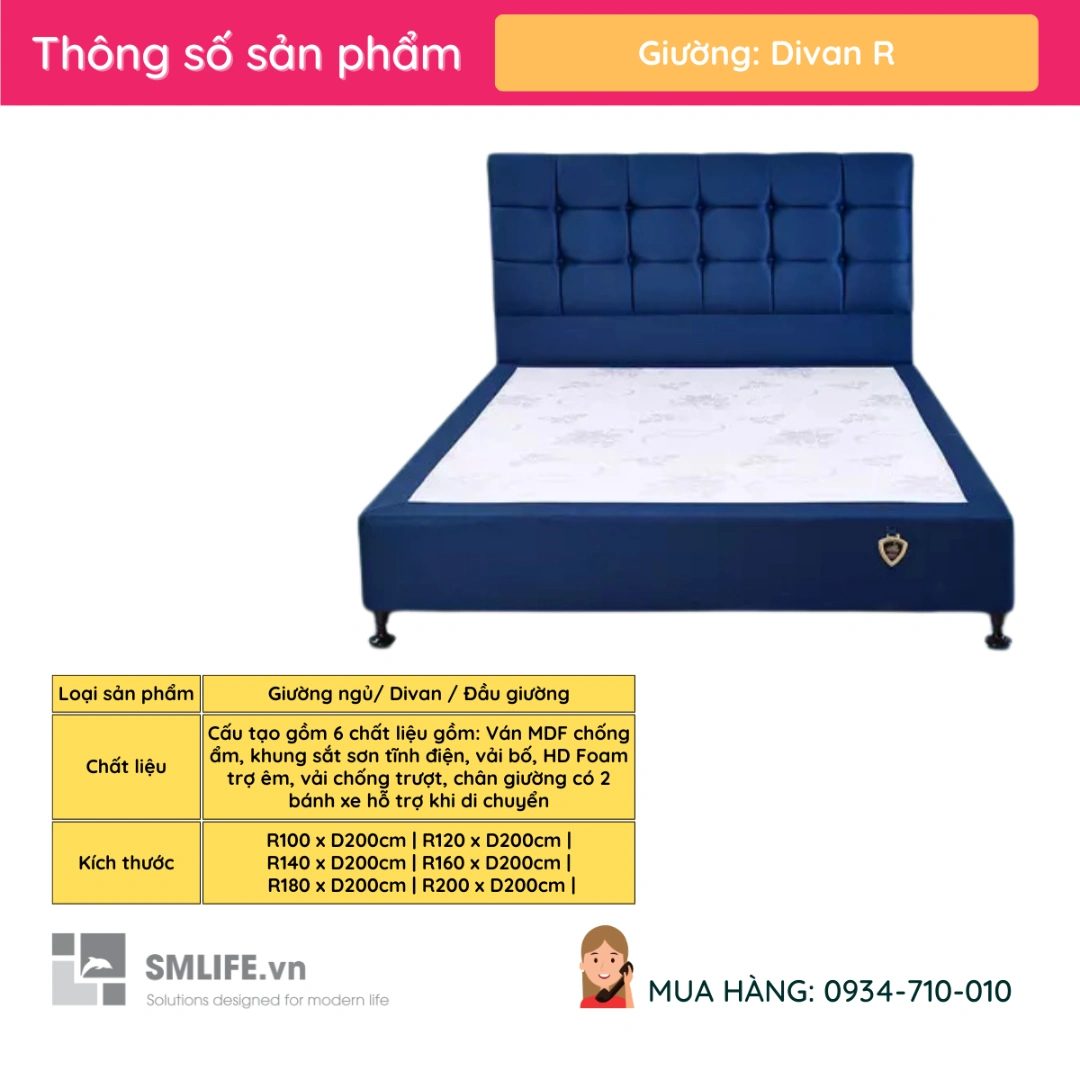 Kích thước | Có 6 kích thước Divan: R100 x D200cm, R120 x D200cm, R140 x D200cm, R160 x D200cm, R180 x D200cm, R200 x D200cm kết hợp với đầu giường |