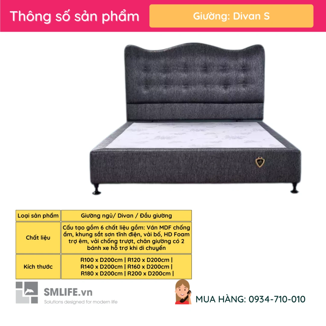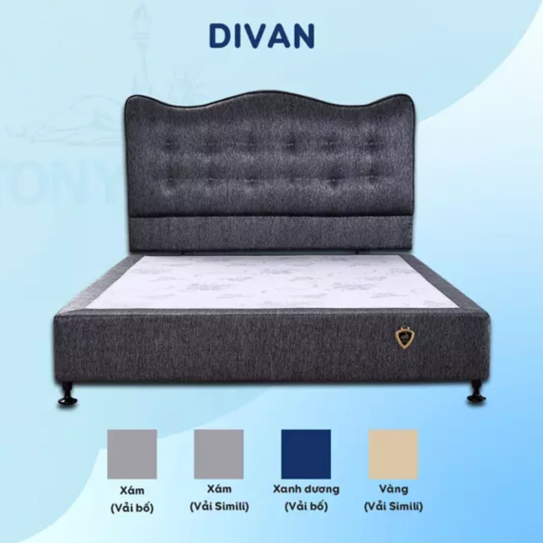 Kích thước | Có 6 kích thước Divan: R100 x D200cm, R120 x D200cm, R140 x D200cm, R160 x D200cm, R180 x D200cm, R200 x D200cm kết hợp với đầu giường |