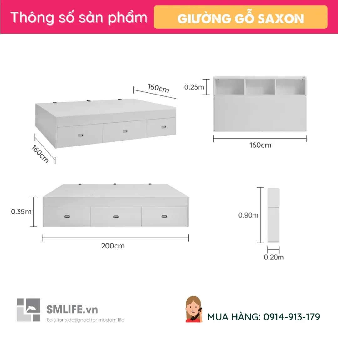 Giường ngủ gỗ MDF kiểu dáng hiện đại Saxon với phong cách đơn giản sẽ là điểm nhấn nổi bật cho phòng ngủ của bạn. Sản phẩm phù hợp với nhiều phong cách nội thất từ hiện đại cho tới cổ điển, vintage. Giường ngủ gỗ SMLIFE được thiết kế cân đối và cực kỳ chắc chắn mang đến nhiều không gian lưu trữ ở đầu giường và gầm giường… Sử dụng vật liệu ván ép công nghiệp MDF chống ẩm phủ Melamine cao cấp giúp giường ngủ SMLIFE có độ bền cao, chống trầy và chống ẩm rất tốt. SMLIFE có hàng chục mẫu giường ngủ với thiết kế mới lạ, độc đáo chắc chắn sẽ mang đến sự ấm áp cho phòng ngủ của bạn.