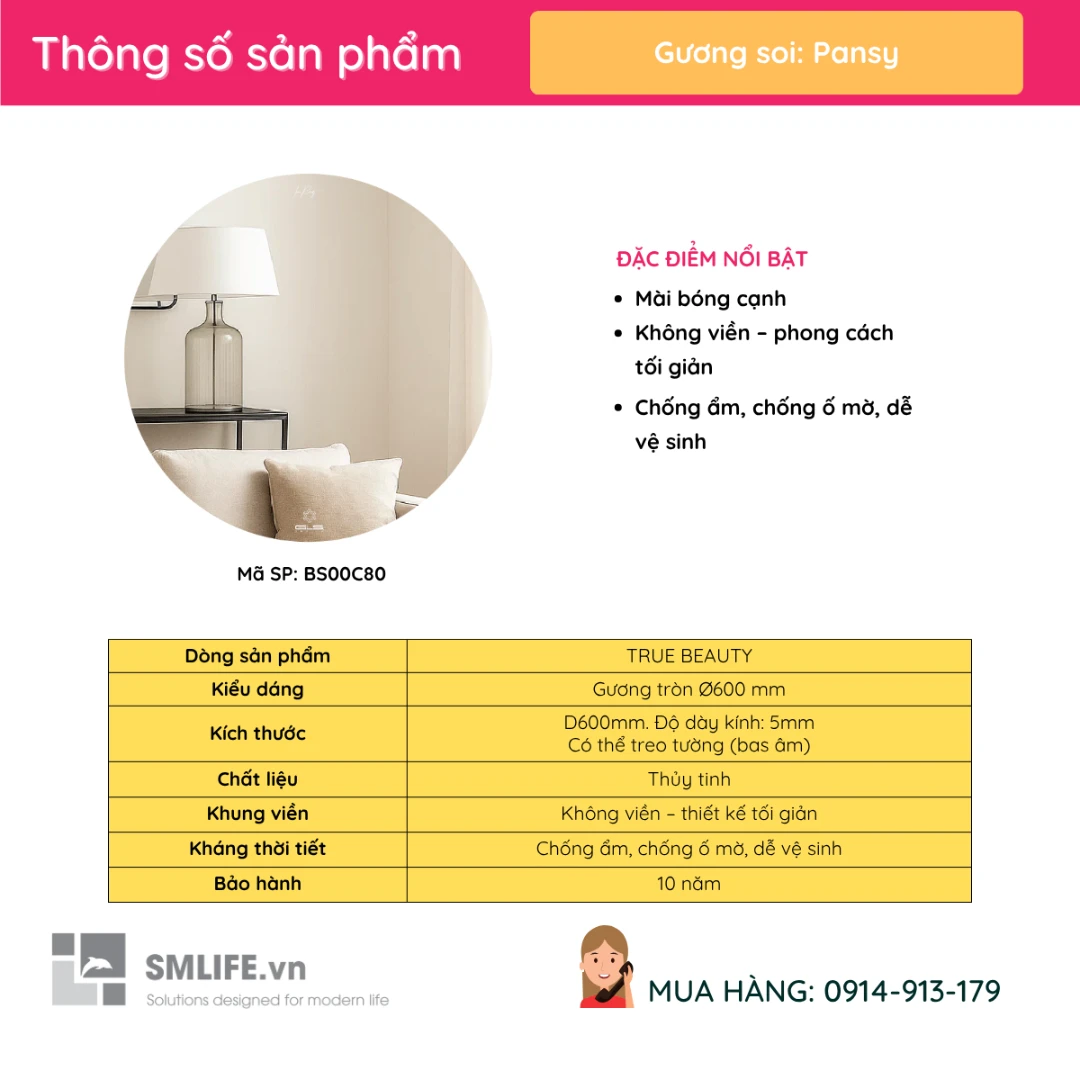 Gương soi hình tròn GLS D60cm PANSY phù hợp cho phòng tắm, phòng ngủ, spa, khách sạn hoặc showroom, giúp tăng độ sáng và chiều sâu cho không gian, mang đến vẻ hiện đại và thanh lịch.