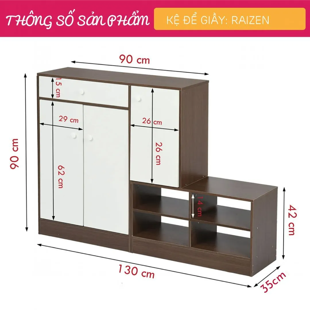 Kệ để giầy gỗ Raizen với phong cách đơn giản sẽ là điểm nhấn nổi bật cho lối ra vào căn hộ của bạn. Sản phẩm phù hợp với nhiều phong cách nội thất từ hiện đại cho tới cổ điển, vintage. Kệ để giầy gỗ SMLIFE có nhiều kệ và hộc ngăn kéo giúp tổ chức gọn gàng giầy dép. Sử dụng vật liệu ván ép công nghiệp MDF chống ẩm phủ Melamine cao cấp giúp kệ giầy SMLIFE có độ bền cao, chống trầy và chống ẩm rất tốt.