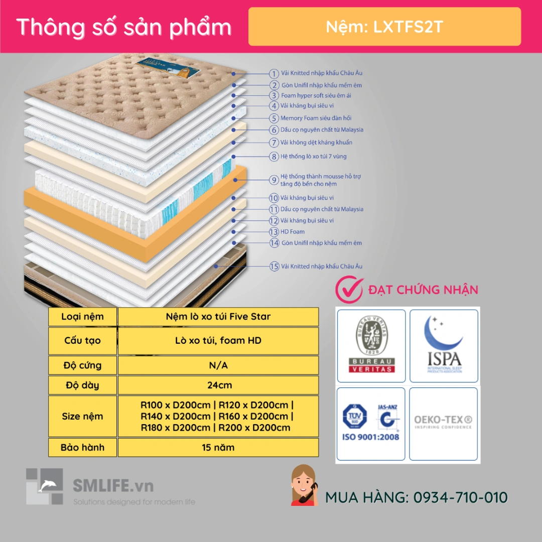 Nệm lò xo túi Five Star 2 tầng nhiều size LXTFS2T