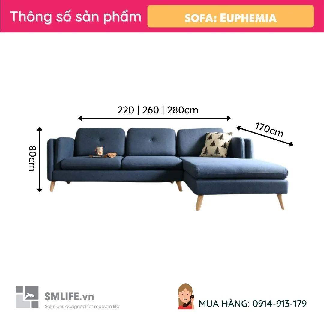 Sofa góc L Euphemia - Xanh Đậm được thiết kế đơn giản theo phong cách hiện đại trang nhã phù hợp với không gian rộng như phòng khách. Lợi ích của Sofa góc là có thể dùng làm gường nhỏ khi ngủ. Với chất liệu được làm từ vải cao cấp, khung gỗ thông Pine và Mousse ( D40 theo tiêu chuẩn xuất khẩu. Vải : vải AGB nhập khẩu Đài Loan, màu sắc khách có thể btùy chọn mẫu vải theo catologe ) thì sản phẩm luôn lựa chọn phổ biến cho mọi gia đình ngày nay.