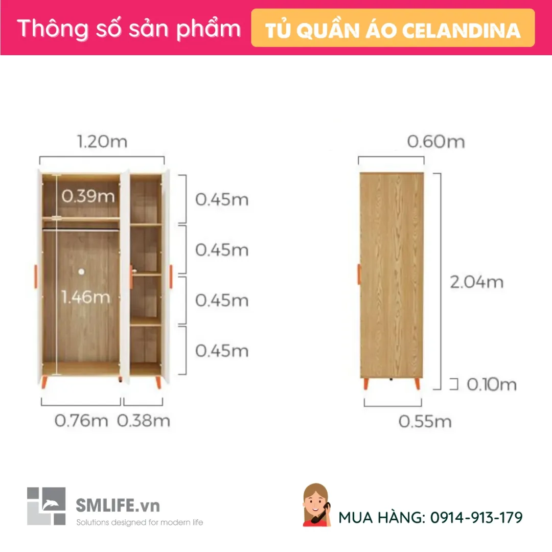 Tủ áo nhỏ gọn cho bé tủ gỗ MDF cao cấp Celandina với phong cách đơn giản sẽ là điểm nhấn nổi bật cho phòng ngủ của bạn. Sản phẩm phù hợp với nhiều phong cách nội thất từ hiện đại cho tới cổ điển, vintage. Tủ quần áo gỗ SMLIFE được thiết kế cân đối và cực kỳ chắc chắn mang đến nhiều không gian lưu trữ quần áo và đồ dùng. Sử dụng vật liệu ván ép công nghiệp MDF chống ẩm phủ Melamine cao cấp giúp tủ quần áo SMLIFE có độ bền cao, chống trầy và chống ẩm rất tốt. SMLIFE có hàng chục mẫu tủ quần áo với thiết kế mới lạ, độc đáo chắc chắn sẽ mang đến sự ấm áp cho phòng ngủ của bạn.